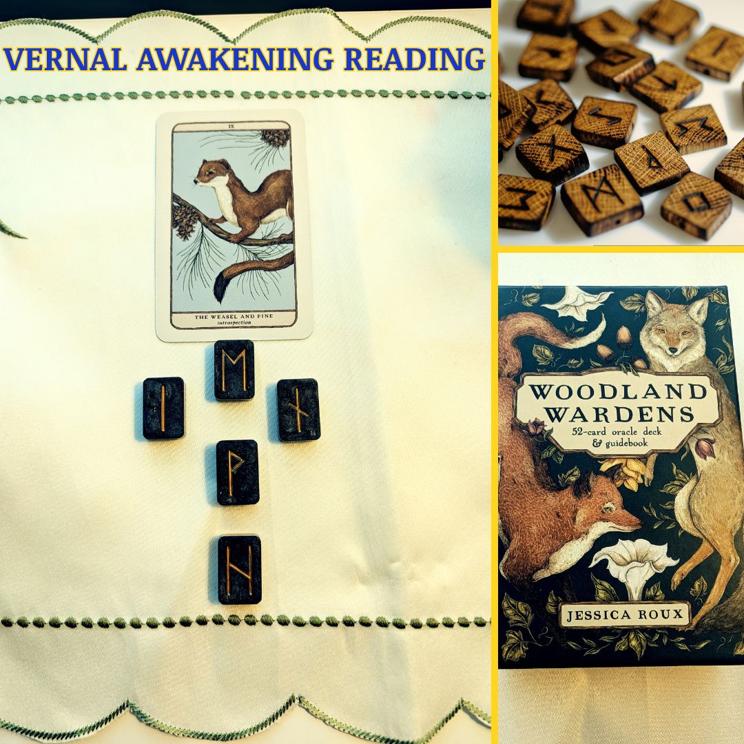 A photo collage showing the Vernal Awakening reading, a collection of Runes, and the Oracle Deck Woodland Guardians